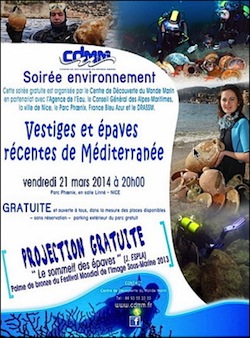 Dans le cadre de la journée de la Méditerranée (21 mars) instituée par l’Assemblée Parlementaire de la Méditerranée, le Réseau Euro-Méditerranéen et le Centre de Découverte du Monde Marin organisent, le vendredi 21 mars à 20h00 au parc Phœnix, une conférence sur les derniers vestiges et les récentes épaves découvertes en Méditerranée.